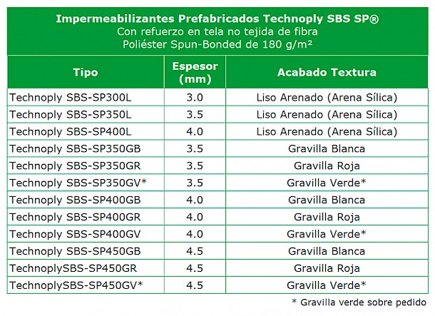 Technoply SBS® es una membrana impermeable con alta resistencia al envejecimiento, a los hongos y al contacto con el agua. Además, posee propiedades impartidas por el butadieno que imparte flexibilidad y el estireno que sirve como puente de fuerte unión entre las moléculas de butadieno y que imparte al sistema propiedades de tenacidad y resistencia a los rayos ultravioleta.