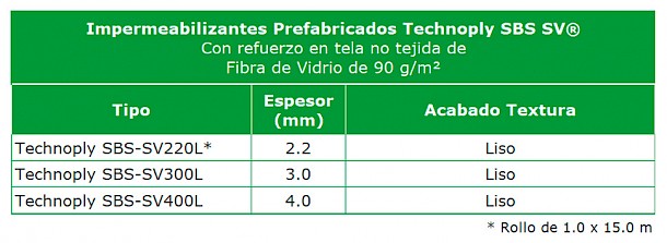 Technoply SBS® es una membrana impermeable con alta resistencia al envejecimiento, a los hongos y al contacto con el agua. Además, posee propiedades impartidas por el butadieno que imparte flexibilidad y el estireno que sirve como puente de fuerte unión entre las moléculas de butadieno y que imparte al sistema propiedades de tenacidad y resistencia a los rayos ultravioleta.